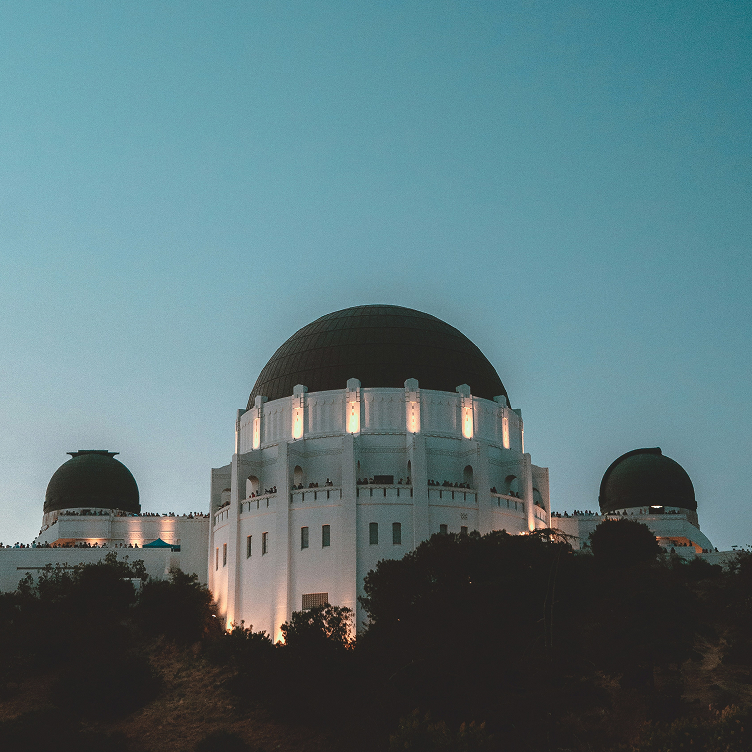 The logo features a distinct outline of The Griffith Observatory's main dome on the left side. The outline captures the iconic shape of the dome, showcasing its recognizable architecture. It consist of a clean and simplified outline that retains the essential structure of the dome, emphasizing its unique silhouette.